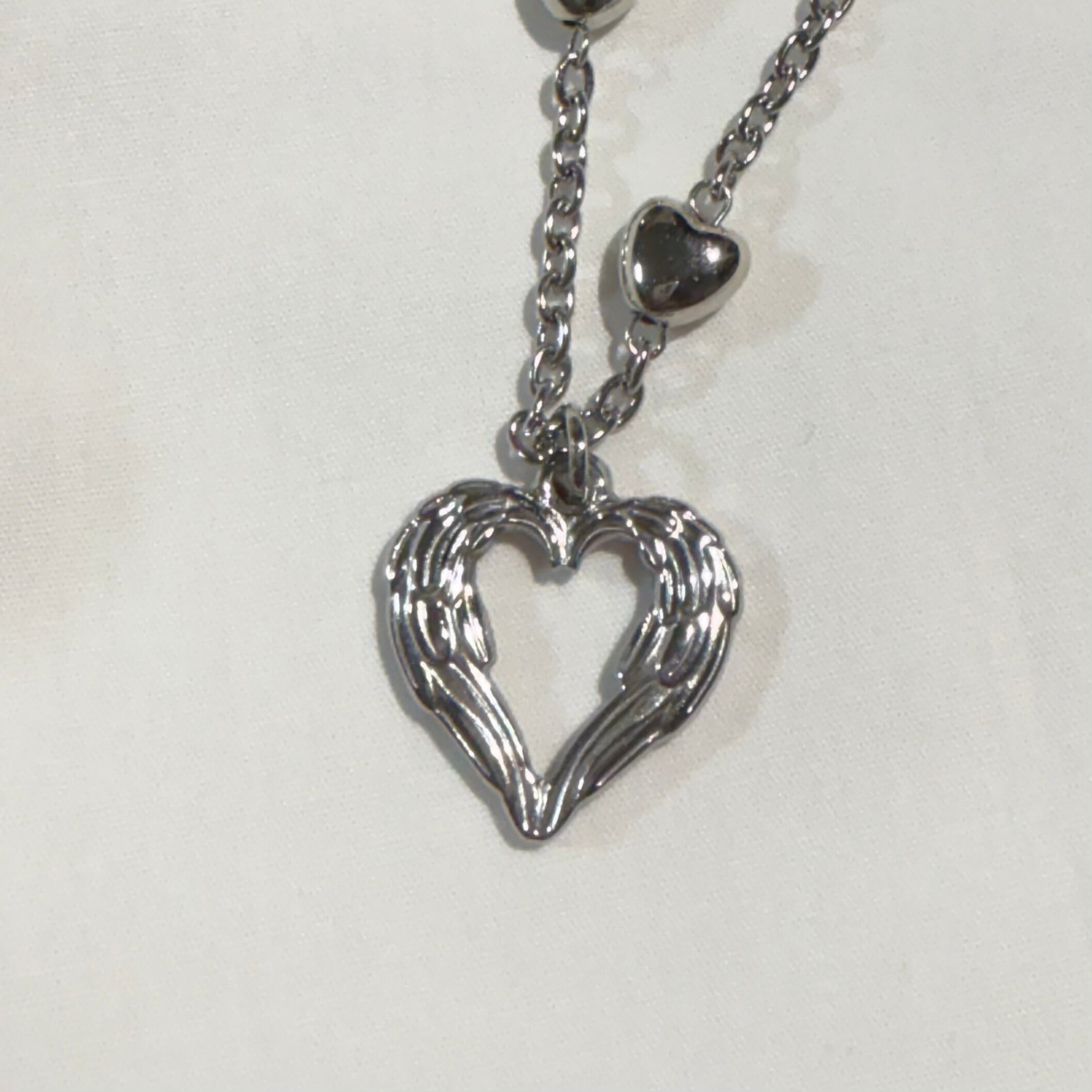 甘さを抑えた羽のハートモチーフが、胸元にさりげない存在感を添えるネックレスです。