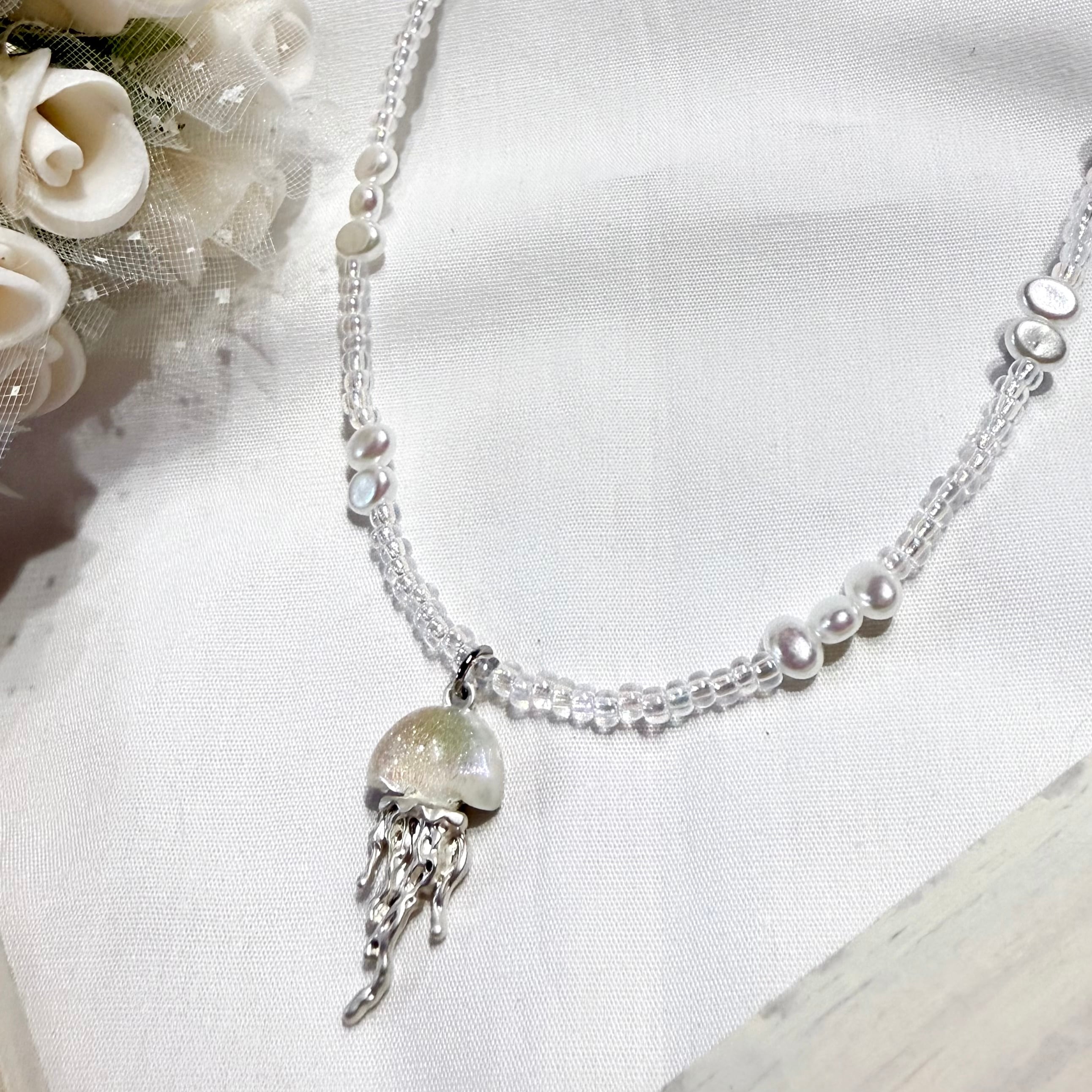 透明感のあるビーズとパールに、揺れるクラゲチャームを合わせたネックレス。
