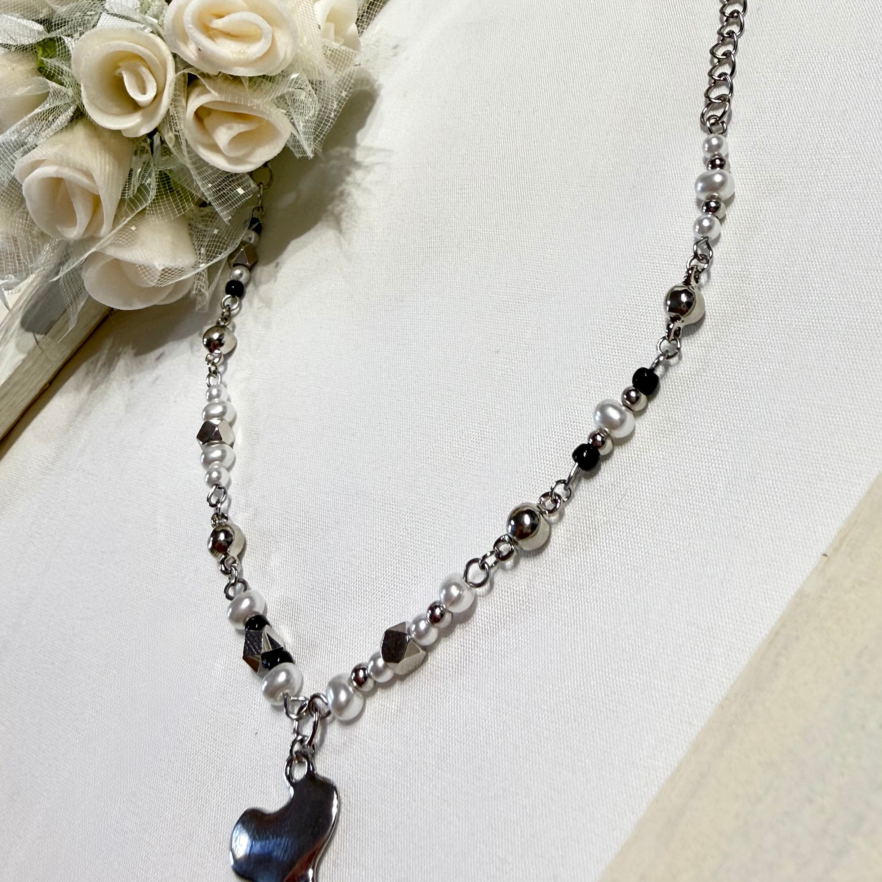溶けたようなハートチャームに、パールやメタルビーズ、ブラックビーズをミックスしたネックレス。